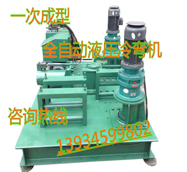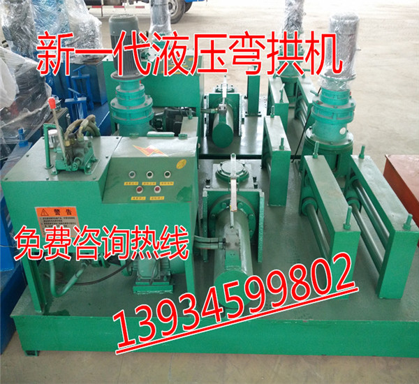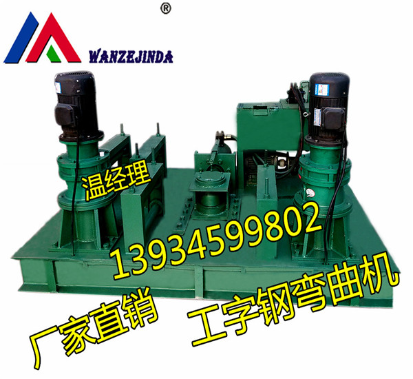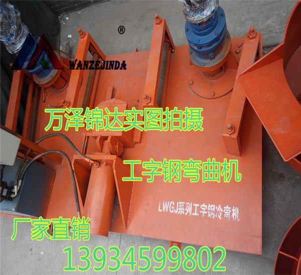 將工字鋼放在冷彎?rùn)C(jī)上,與減速帶動(dòng)的滾輪接觸后,將壓緊手柄進(jìn)給鎖緊,啟動(dòng)電機(jī)油泵組,由電動(dòng)油泵輸出的高壓溢閥(可調(diào)整所有壓力),進(jìn)入集成塊到電纜閥,有電液閥和動(dòng)點(diǎn)開(kāi)關(guān)(點(diǎn)進(jìn),點(diǎn)退)控制油缸工作,工作油缸推進(jìn),將U型鋼與三個(gè)支撐游輪壓緊并為發(fā)生彎曲變形是時(shí)開(kāi)始計(jì)算,油缸推進(jìn)的長(zhǎng)度進(jìn)程為10mm-15mm,開(kāi)主電機(jī)帶動(dòng)U型鋼工作,反復(fù)操作,達(dá)到所需為止。