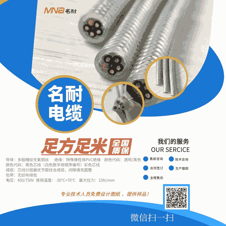 應用安裝范圍連接和控制電纜適用于干燥或潮濕的室內,特別是工業(yè)使用環(huán)境下的各種電氣安裝。截面在0.5mm2及以上的作為控制和連接軟線還特別適合用在機床制造,成套設備安裝工程,電站,暖氣和空調安裝等場合。鑒于其特殊的柔性設計,它還適用于無應力緩釋可強制引導的自由非連續(xù)性往返運動下的安裝和固定鋪設。(不作為拖鏈電纜使用)