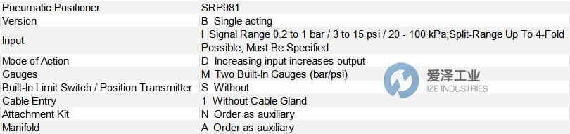 FOXBORO定位器SRP981-BIDMS1NA技術(shù)規(guī)格