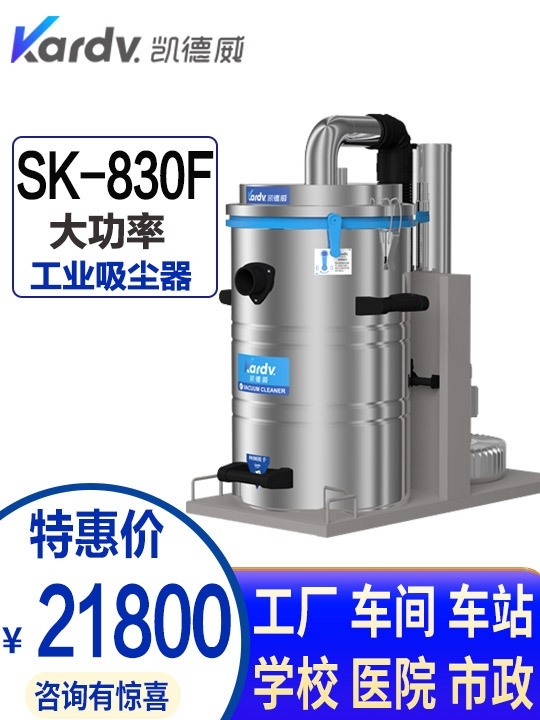 產品簡介: 凱德威大功率工業(yè)吸塵器SK-810是一款自主研發(fā)的智能型三相工業(yè)吸塵器,具有防缺相,漏電,過載的保護能力。采用工業(yè)設計風格,外形剛勁有力,做工精良,美觀大氣,黑灰色調搭配彰顯本機十足的工業(yè)風, SK - F系列是我司自主研發(fā)的智能型工業(yè)吸塵器。具有以下六大亮點: A.整機采用工業(yè)設計風格,外形剛勁有力,做工精良美觀,黑灰色調搭配彰顯十足的工業(yè)風。三角穩(wěn)定框架結構,讓本機更堅固,前后雙置推手,操作機器前進后退方便快捷。145°后仰下滑式操控面板設計,有效地做到防灰,防噴濺水,防碰撞,防誤操作的四防安全設計。推手設計于操控面板前15cm處,不阻擋操控面板視野又可起到防撞保險杠之作用,有效保護了電控箱和操作面板的誤撞擊損壞。 B.集塵桶固定把手設計,在機器上起到固定集塵桶作用,清理灰塵即可作為推拉把手使用,有效的減輕勞動強度,做到移動不彎腰,傾倒不費力,安裝簡單等優(yōu)點。 C.采用直徑160mm的TPE靜音前后大輪,可輕松通過不平整之路面。后萬向輪設計使移動拐彎擁有精準的靈活性。 D.電控系統(tǒng)采用凱德威自主設計帶有液晶顯示屏的智能PLC電控控制系統(tǒng),具有一鍵操作,軟啟動,防缺相,防漏電,防過載和防過熱以及故障自動分析的能力,并裝有相序正反運轉一鍵調節(jié)開關,省去了動力電換線的煩惱,更安全、更便捷。 E.動力源采用凱德威FY系列定制主機,并選用NSK耐高溫防塵軸承,保證了長時間運行的穩(wěn)定性,全耐高溫鋁鎂合金內外材料并經過氟碳噴涂,具有抗靜電,耐腐蝕,增加強度的優(yōu)點。 F.全自動電子反吹清灰系統(tǒng)具有人工免保養(yǎng),吸力強勁、穩(wěn)定,故障率低,提高工作效率等優(yōu)點,也可根據(jù)實際工況需求自行調節(jié)設置自動清灰時間和頻率,實現(xiàn)一機多用,節(jié)約成本。 G.集塵系統(tǒng)采用100L不銹鋼材質的上下分離桶,桶壁光滑易清理,分離桶上配有四個萬向輪和不銹鋼推手,移動傾倒垃圾時輕松方便;機器后倉上配有置物架,方便配件與其它工具的放置。 產品圖片: