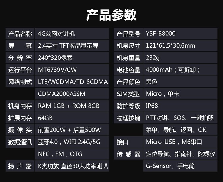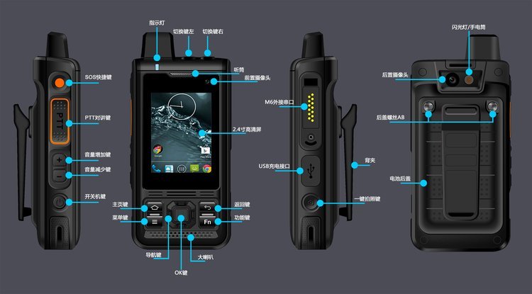 WIFI支持,2.4G/5G(802.11ac/a/b/g/n)藍(lán)牙支持,BT4.0定位GPS 北斗 GLONASSNFC支持,NXP PN553常規(guī)參數(shù)系統(tǒng)Android 8.1屏幕2.4英寸 觸摸屏處理器MT6739V 四核 1.5GHz內(nèi)存RAM 1GB ROM 8GB相機(jī)前置200W,后置500W接口Mirco-usb,M6標(biāo)準(zhǔn)口按鍵開(kāi)關(guān)機(jī),音量 /-,PTT,SOS,拍照,功能鍵*5電池4000mAh(可拆卸),支持快充/座充防摔等級(jí)防水/防塵IP68防水防塵防跌落/震動(dòng)1.5米自由跌落,MIL-STD-810G工作溫度-20℃至 55℃存儲(chǔ)溫度-40℃至 70℃其它功能傳感器陀螺儀,指南針,重力傳感器,光線傳感器可選本安防爆