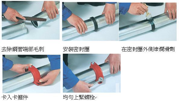 4、只需機械組裝:安全 用溝槽式不銹鋼卡箍接頭及相應的管件安裝施工。