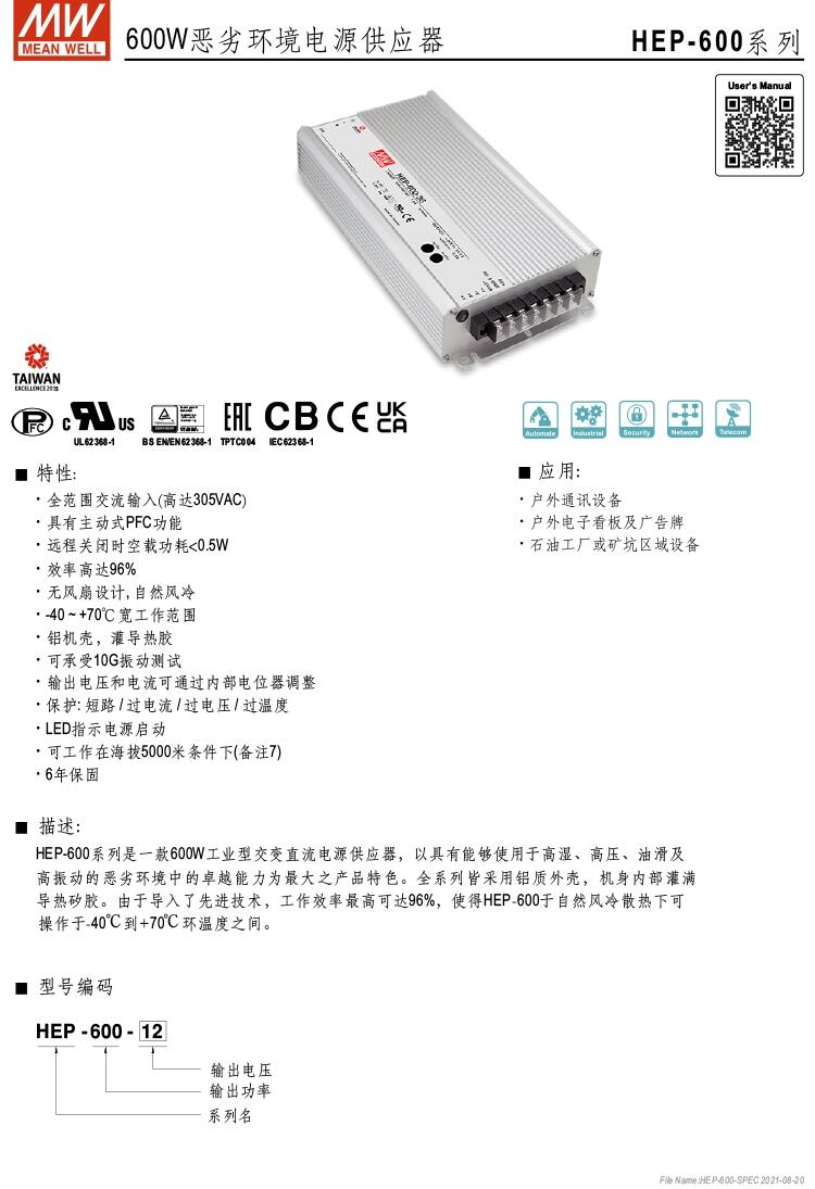 明緯HEP-600-15 600W惡劣環(huán)境電源供應(yīng)器