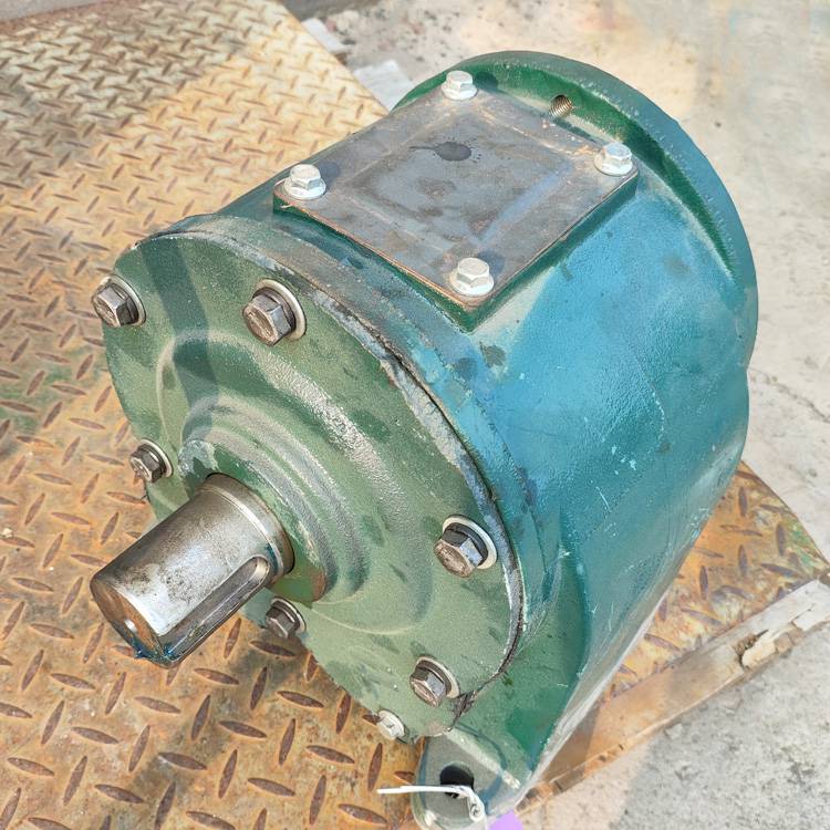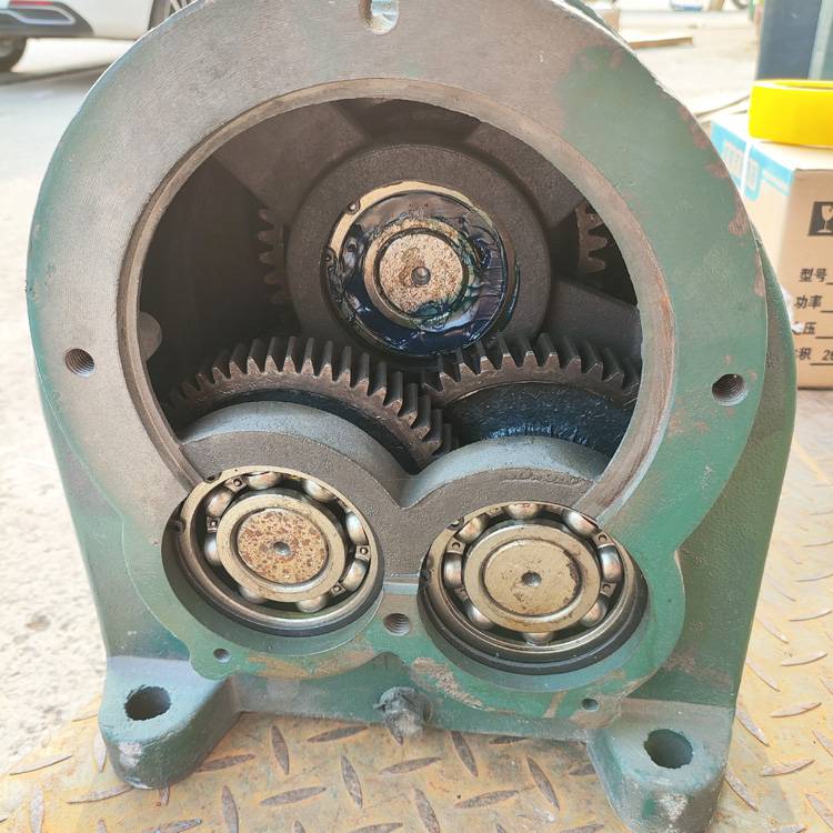 JZM450型攪拌機減速機,安裝在滾筒式膠輪摩擦傳動JZM450型混凝土攪拌機的兩側(cè),配套4KW攪拌電機使用。減速機外殼鑄鐵制造,三級變速,和電機為直連方式,電機軸上的小齒輪為22齒斜齒,減速機內(nèi)部有17齒直齒軸,18齒斜齒軸,50齒和58齒斜齒盤齒輪,47齒直齒盤齒輪。齒輪變速箱輸出軸直徑50mm,鍵槽寬度16mm,中心高約20.5cm,地腳安裝孔距20*23.5cm。齒輪軸同時配套軸承,油封,卡簧等配件,輸出軸和傳動軸上常安裝18齒牙鏈輪,采用背靠背雙鏈輪并包裹18節(jié)雙排1寸鏈條做為聯(lián)軸器使用從而帶動傳動大軸驅(qū)動攪拌機。電機和減速機裝配時需在連接處兩側(cè)邊沿打密封膠,并螺栓固定好,使用前需加注適量齒輪油。