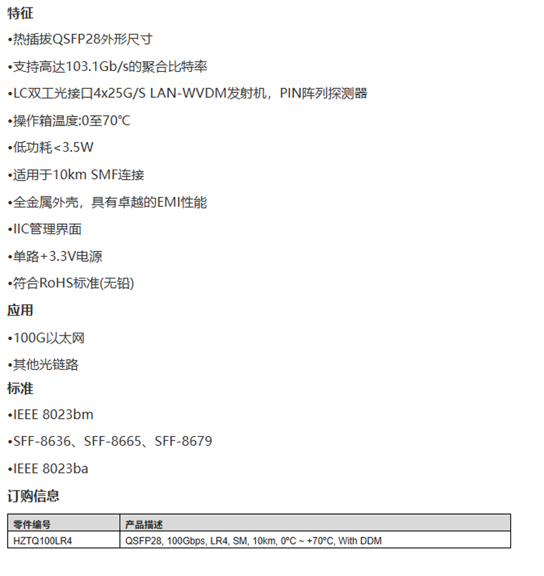 HZTQ100LR4以太網(wǎng)光模塊10km
