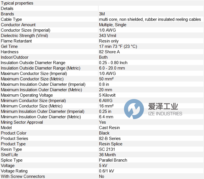 3M? 82 F 系列樹脂內(nèi)嵌電纜接頭套件包括 Scotch® 橡膠接頭膠帶 23、Scotchcast? 化合物 2131 和三個(gè) M Ite? Elek Tro Cut? 砂布 80J 砂礫。半柔性復(fù)合材料提供永久拼接,可隨電纜彎曲,便于安裝、卷取和處理。光滑的錐形接頭可防止電纜掛起和接頭端部抬起。阻燃化合物 2131 是一種自固化樹脂,可與自身和現(xiàn)代電纜護(hù)套粘合。該套件非常適合拼接 1 kV 額定多根導(dǎo)線和 5 kV 額定單根導(dǎo)線。符合 RoHS 2011/65/EU 和 MSHA 批準(zhǔn)。