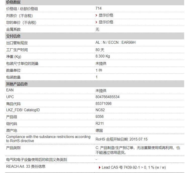 出口管制規(guī)定 | AL | N / ECCN | N |