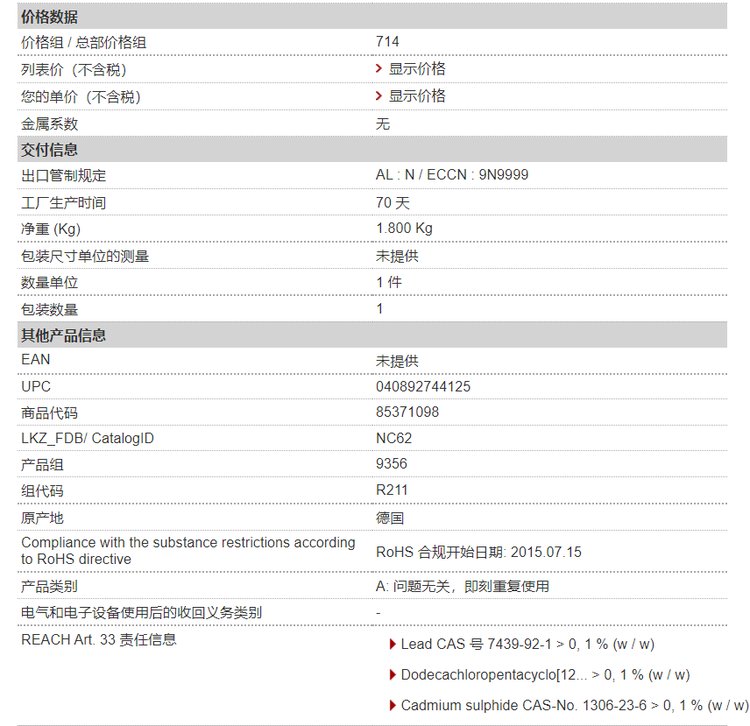 出口管制規(guī)定 | AL | N / ECCN | N |