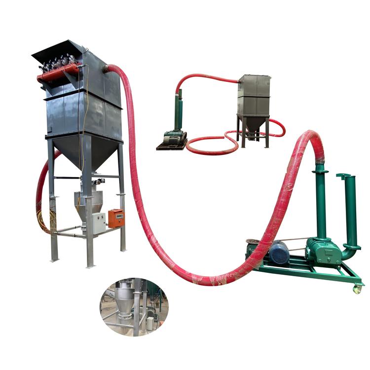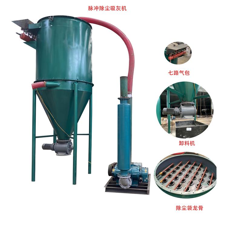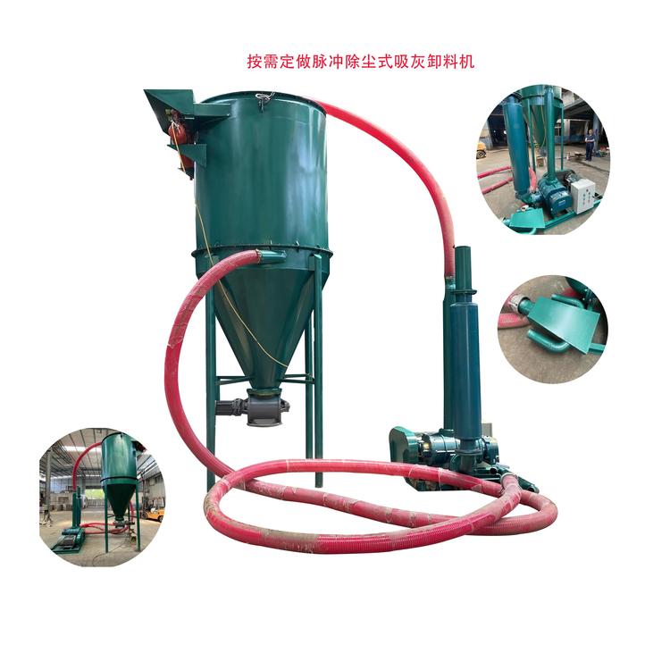 氣力吸灰機系統(tǒng)工作時啟動羅茨鼓風機,由其產(chǎn)生高壓柱狀空氣流,高壓柱狀空氣流經(jīng)過文丘里噴射泵,內部產(chǎn)生一個負壓,使旋轉供料器供給下來的物料被及時吸入文丘里噴射器的噴射口。物料由經(jīng)輸送管道輸送至儲料倉。然后儲料倉頂部安裝的倉頂除塵器使物料與輸送氣流分離,剩余的氣流及時排出室外,也避免現(xiàn)場產(chǎn)生太多的粉塵。