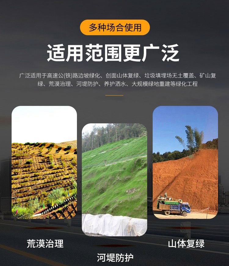 適用場景 | 高速公(鐵)路邊坡綠化、低邊坡、創(chuàng)面山體復(fù)綠、垃圾填埋場無土覆蓋、礦山復(fù)綠、荒漠治理、河堤防護(hù)、養(yǎng)護(hù)灑水、大規(guī)模綠地重建等綠化工程。 | ||
