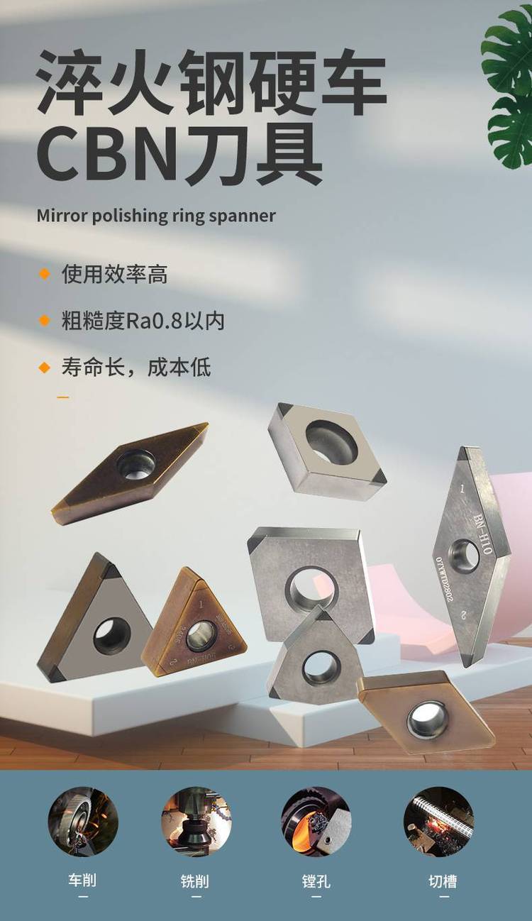 ??? (3)潔凈生產(chǎn):以車代磨是通過使剪切部分的材料退火變軟而形成切削的,若冷卻率過高,則會減小由切削力而產(chǎn)生的這種效果,從而加大機械磨損,縮短刀具壽命,因此CBN刀具車削淬硬鋼時不需要添加切削液。對于尺寸受溫差影響較大的零件,用戶可以選擇風(fēng)冷;對于需潤滑而非降溫目的的切削狀態(tài),可選擇具備濕切功能的CBN刀具材質(zhì)如BN-H20,BN-H10。