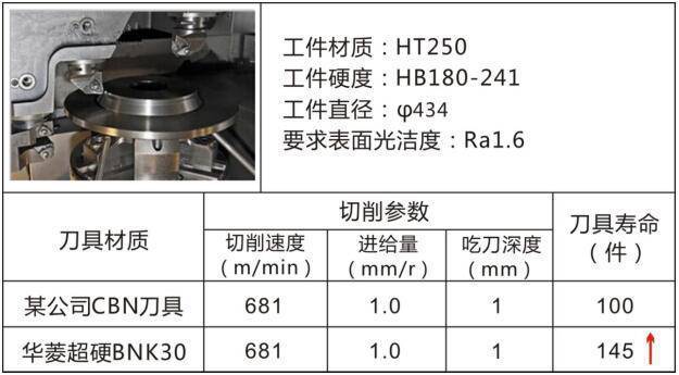??? 針對普通的灰鑄鐵,硬度不高,CBN刀具和合金刀具均可加工,具體看客戶的需求,如果被加工工件少量,而且表面質(zhì)量要求不高,選擇合金刀具即可完成,經(jīng)濟(jì)性更好。如果被加工工件批量生產(chǎn),表面質(zhì)量要求較高,生產(chǎn)節(jié)拍抓的比較緊,則選擇CBN刀具,BNK30牌號線速度可達(dá)到1500m/min,吃刀深度0.5mm以內(nèi),如果粗加工工序則選擇BN-S300牌號,單次吃刀深度2mm沒問題。球磨鑄鐵則更多的建議使用合金刀具加工,球磨鑄鐵自身特性的問題,CBN刀具只建議用于球鐵牌號QT600以上