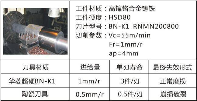 ??? 白口鑄鐵相較于灰口鑄鐵硬度高,而且澆筑出來的工件尺寸較大,切削余量不均,有夾砂、氣孔等存在,此類建議選擇CBN刀具加工,合金刀具 度低,不建議使用,如果偶爾加工幾件工件的話到是可以考慮合金刀具,反之則選擇CBN刀具更 如BN-K1牌號整體聚晶CBN刀具,吃刀深度單次4-6mm沒什么問題,而且 ,如加工大型軋輥,BN-K1牌號可完整加工一個軋輥不換刀不崩刀,中間不會出現(xiàn)接刀痕等問題影響表面質(zhì)量。